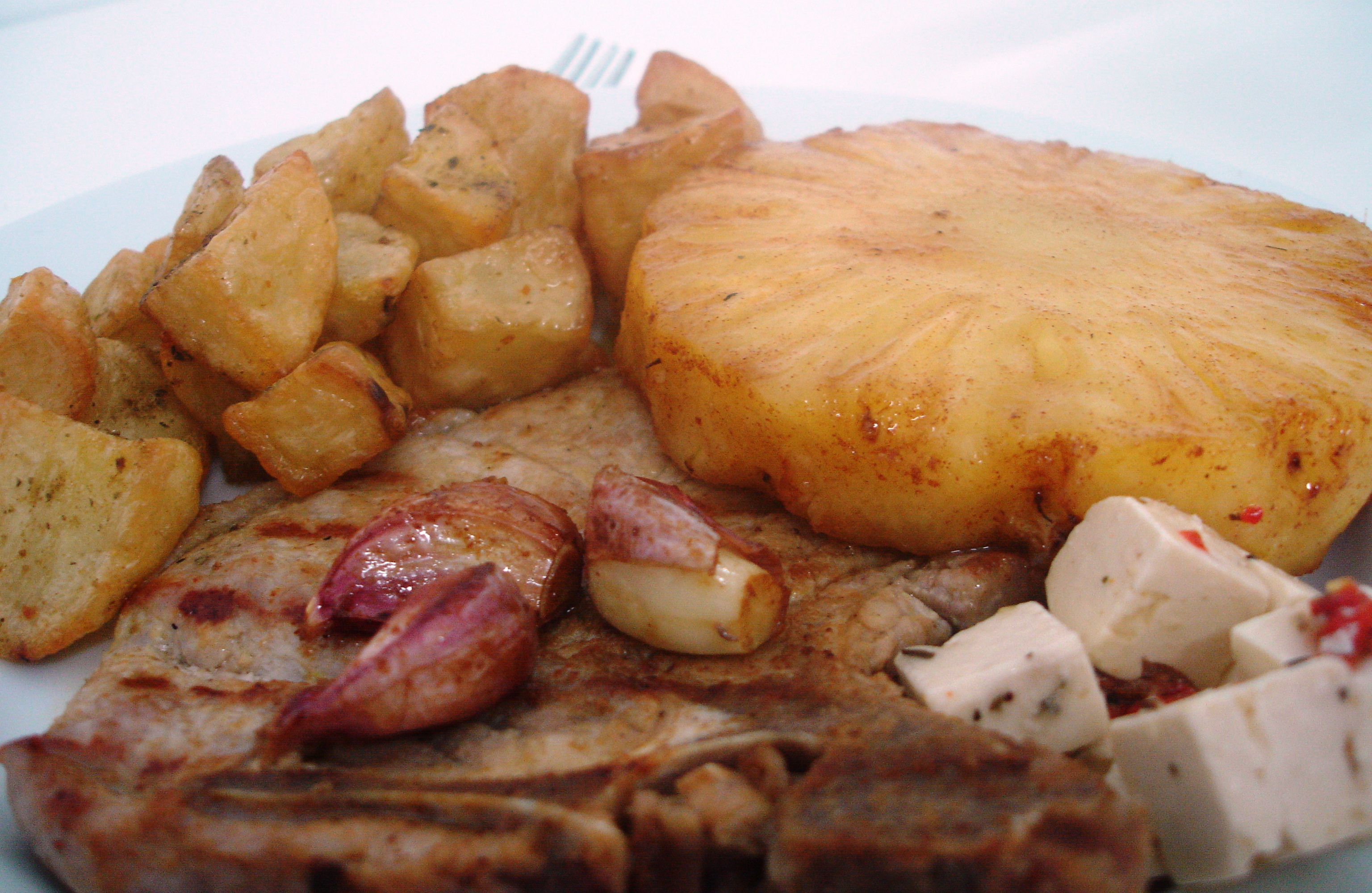 Gosto muito de refeições agridoces, da conjugação de carne com fruta. Sinto que transforma o prato em algo mais leve. Lembrei-me de flamejar umas rodelas de ananás para acompanhar estas costeletas. Como já há muitos dias não comíamos fritos, resolvi atender às súplicas dos mais pequenos – e também do graúdo – e sairam diretamente da actifry estes cubinhos de batata com ervas aromáticas.