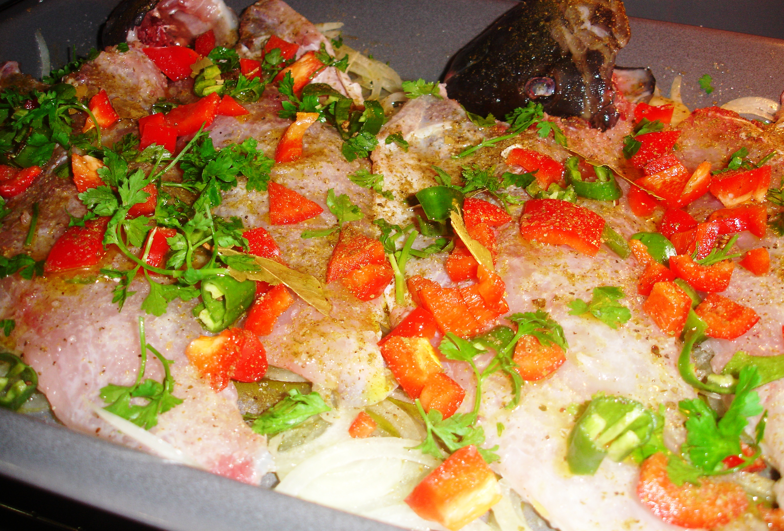 Coloquei o refogado no tabuleiro do forno. Dispus as vejas em cima do refogado. Temperei-as com sal, com as pimentas, alho em pó, louro e acafrão.
