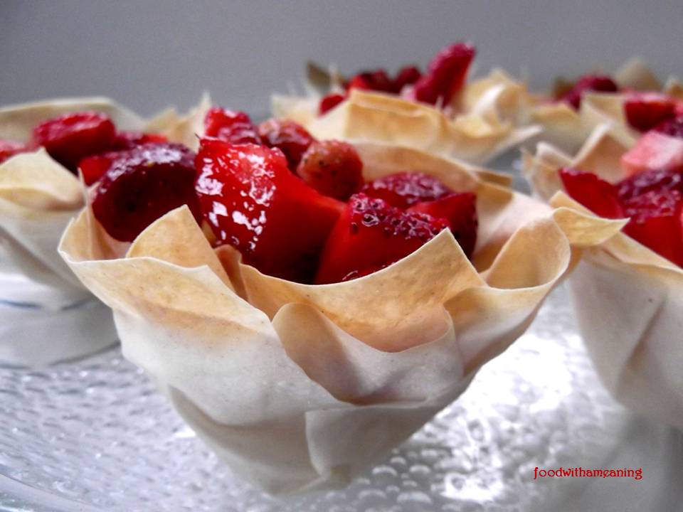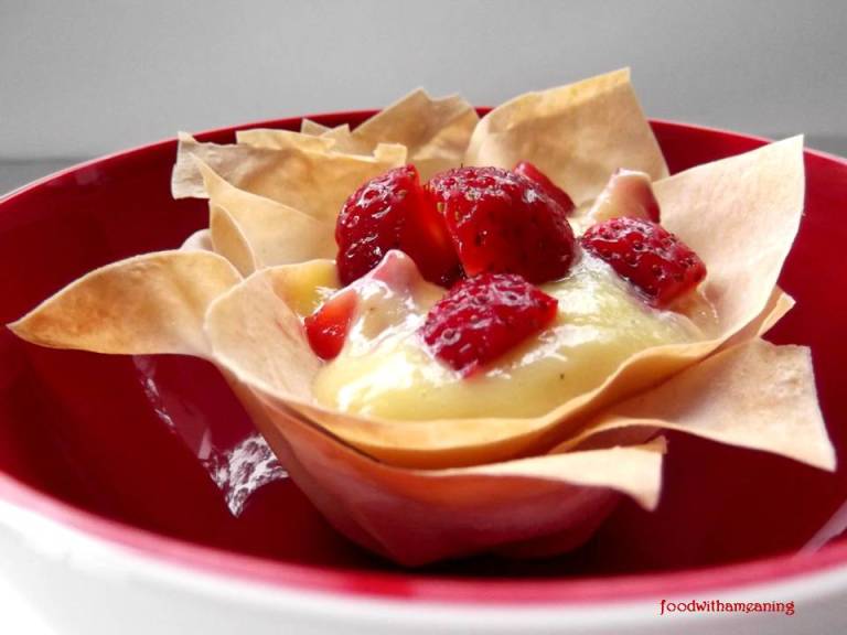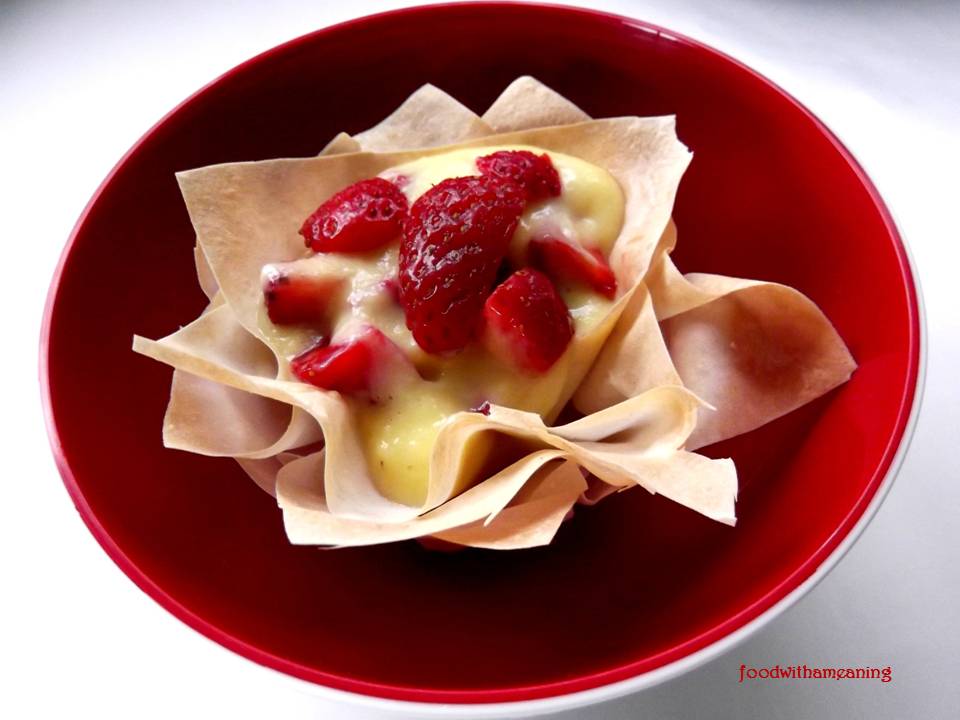 Na hora de servir, retirei o creme do frigorífico e coloquei duas colheres de sopa de creme bem cheias em cada flor de massa filo. Decorei com morangos cortados aos pedacinhos.