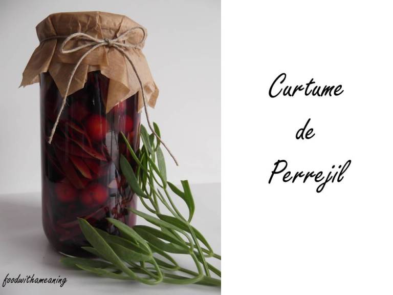 Não deixo passar um ano sem fazer este curtume. É uma tradição familiar, portanto. Assim, e apenas no mês de julho, quando o perrejil está verde e viçoso, dedico umas horas do meu dia à apanha da planta e à preparação do curtume. O ano passado, publiquei a receita no Receitas ao Desafio. Este ano resolvi enriquecê-la com cebolas, pimentos, feijão verde e tomates da minha horta. Adicionei ainda uma folha de louro, uns dentes de alho e umas bagas de pimenta rosa em cada frasco.