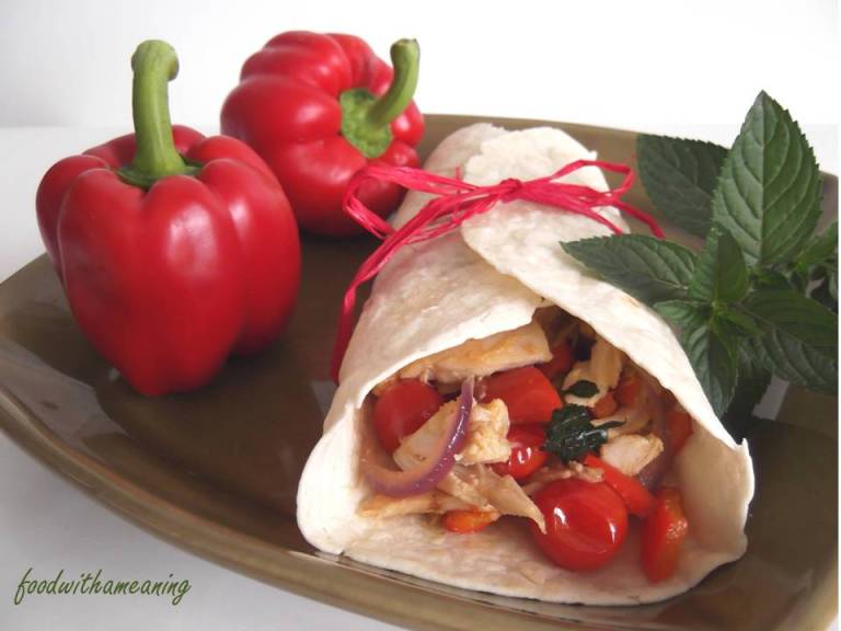 Retirei o preparado  do wok e coloquei porções em cima das tortilhas, transformando-as de seguida em wraps.