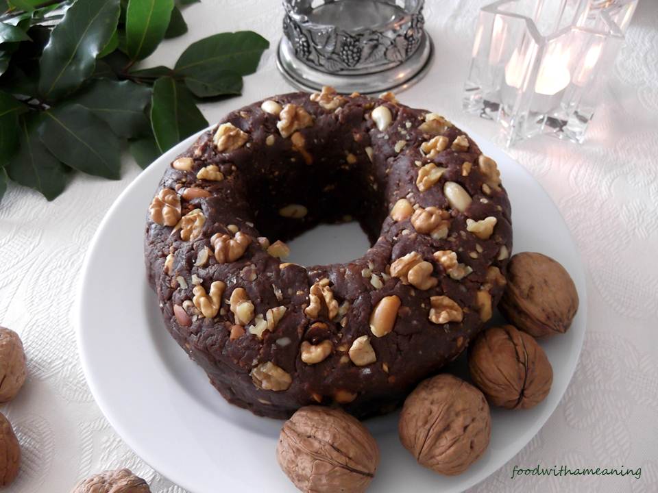O almoço de Natal caracterizou-se por ser simples, para contrastar com os excessos do jantar do dia 24. Ao contrário do que se passa em muitas regiões do nosso continente português, aqui, nos Açores, a ceia de Natal não se limita ao bacalhau cozido com couves. Nas mesas de festa desfilam as entradas de marisco e os assados de aves e de porco como pratos principais. As sobremesas também não se confinam aos bolos da época e às rabanadas, sendo, assim, variadas e intemporais, de acordo com os gostos dos comensais e a sabedoria e paciência das doceiras. Hoje, como sugestões de sobremesa, preparei uma salada de frutos diversos, aromatizada pelo maracujá e colorida pela romã, e um fresco cheesecake de mirtilos. Para acompanhar o café, confecionei esta coroa de salame, rica em nozes, amendoins torrados e pinhões.