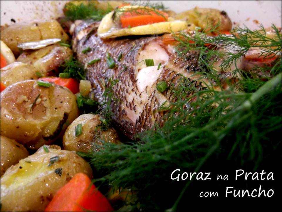 Quando o peixe acabou de assar, retirei-o com cuidado da prata e coloquei-o num tabuleiro com as batatas a murro. Pincelei o peixe de ambos os lados com o molho. Verti o resto do molho sobre as batatas envolvendo-as neste.