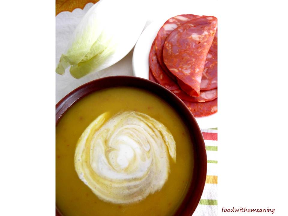 Num tacho, fiz um leve refogado à cebola. Adicionei a courgette, a cenoura e a batata doce aos pedaços e deixei refogar mais um pouco. Junte a água e as endívias em folha. Temperei com sal (pouco), adicionei o chourição e deixei cozer.