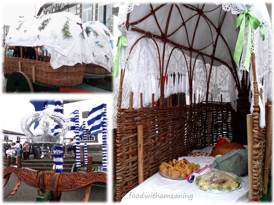 Nas freguesias das Lajes e da Vila Nova, é tradição a decoração destes carros com colchas e toalhas alvas, raminhos de verdura e fitas de cetim.