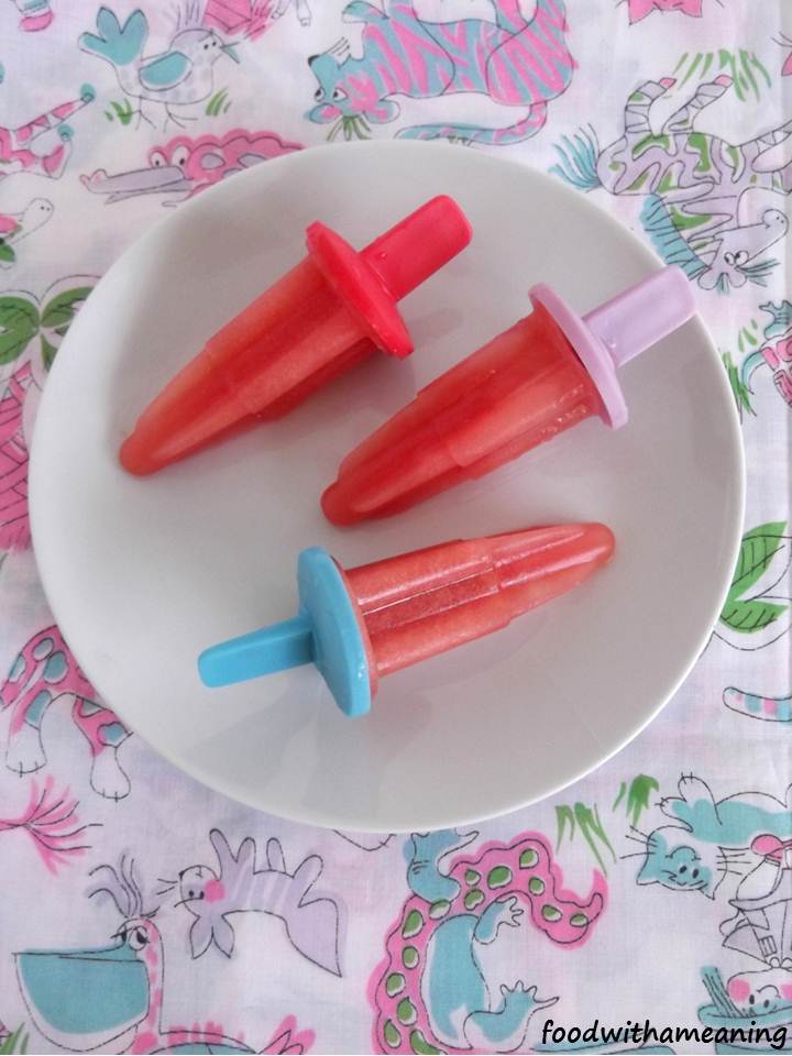 Pois estes picolés foram feitos com o que sobrou de um mega jarro de sumo de melancia com menta. Foi uma experiência muito bem aceite cá por casa, especialmente porque fresca e pouco calórica.