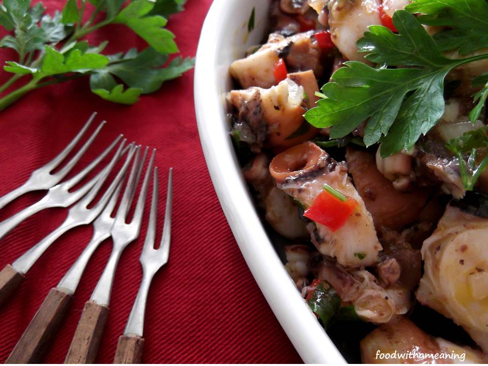 1. Coze-se o polvo com pouco sal, adicionando à água uma folha de louro, uma cebola cortada a meio, dois dentes de alho e uma baga de piri-piri. Escorre-se e deixa-se arrefecer.