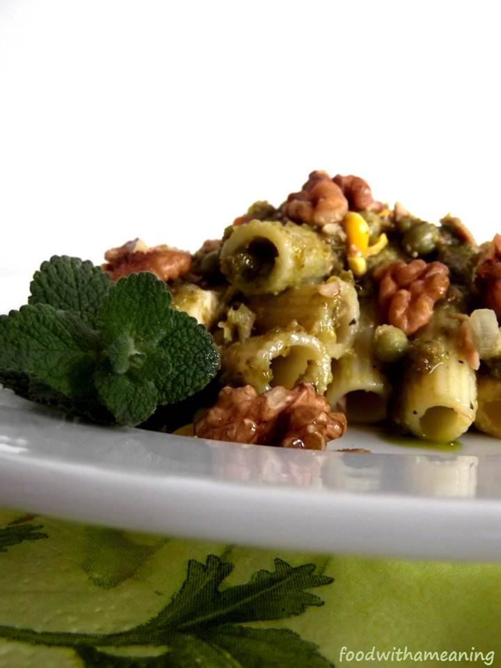 4. Envolve-se a massa no molho pesto e decora-se com nozes.
