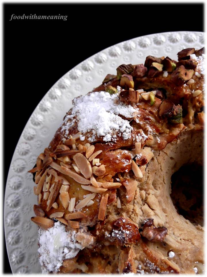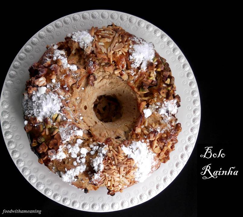 Este Natal,  o Bolo Rainha foi o eleito. O Bolo Rei ficará para o Dia de Reis. Depois de confecionar o Bolo de Frutas, tradicional desta época, resolvi compor a mesa com um bolo que não contemplasse frutas cristalizadas. O Bolo Rainha. Em todos os Natais estão, também, presentes o bolo invertido de ananás e cerejas, o bolo de figo e o bolo de caramelo com cobertura de nozes. Parece um pouco exagerado este desfile de bolos, mas entre a família combinamos para que não se repitam nas mesmas casas. Conseguimos, assim, deliciarmo-nos com uma (ou duas) fatias dos diferentes bolos quando nos visitamos nesta quadra.