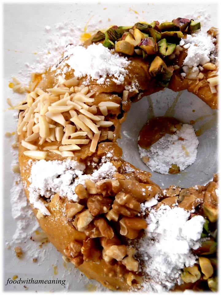 7. Pincelar com gema de ovo, fazer montinhos com o açúcar em pó e decorar com frutos secos.