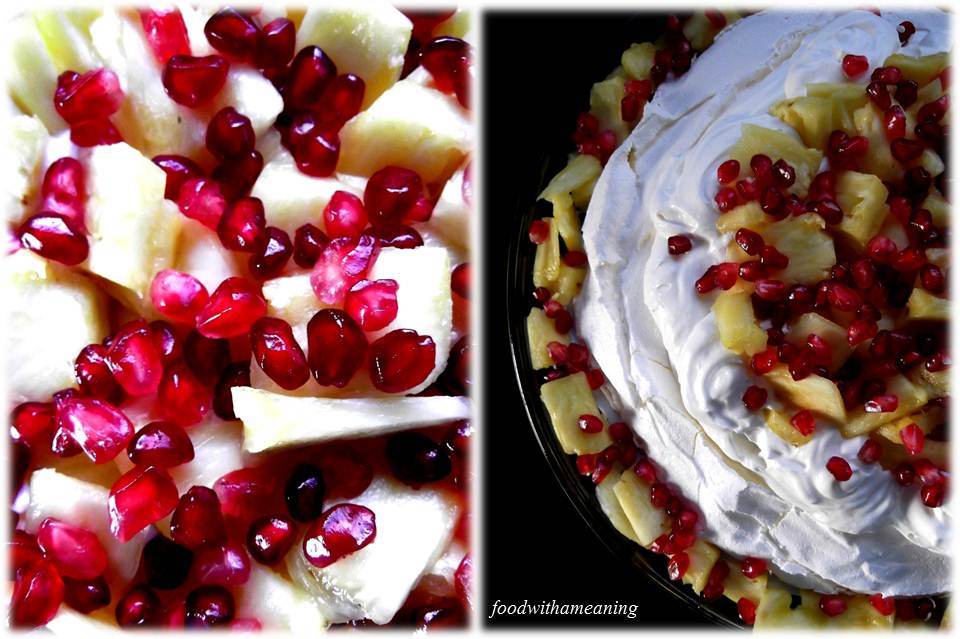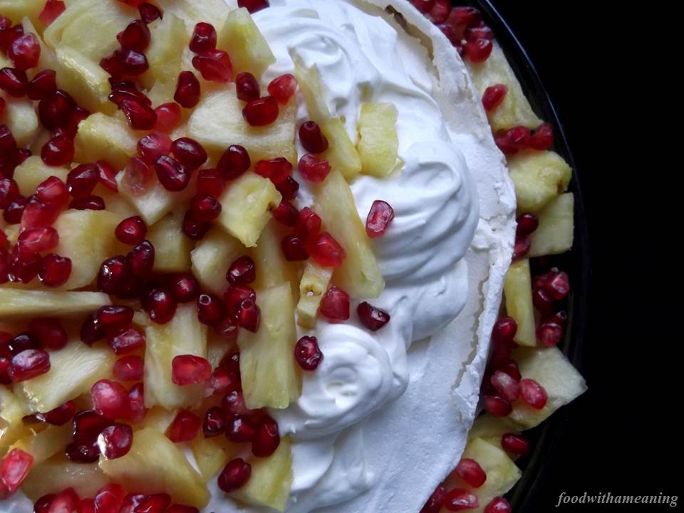Desde que fiz a minha primeira pavlova, considero-me uma pessoa verdadeiramente apreciadora desta sobremesa. O leve crocante da camada exterior de suspiro conjugado com o seu interior espumoso com sabor a marshmellow contrasta muito bem com a cobertura de natas, levemente adocicadas, e com o topping ácido do ananás e fresco da romã.