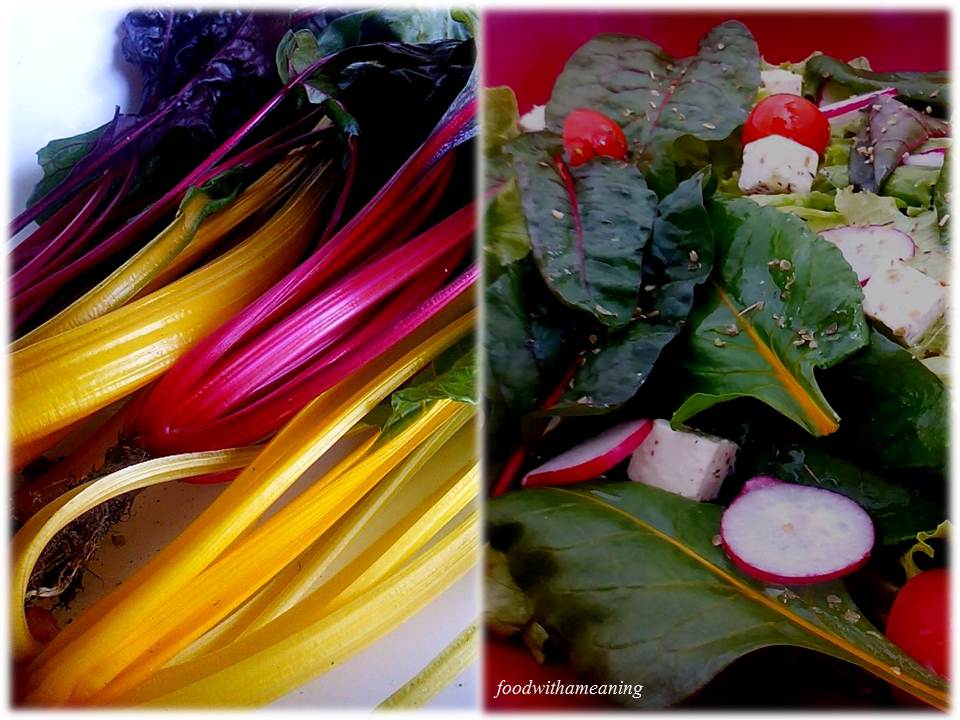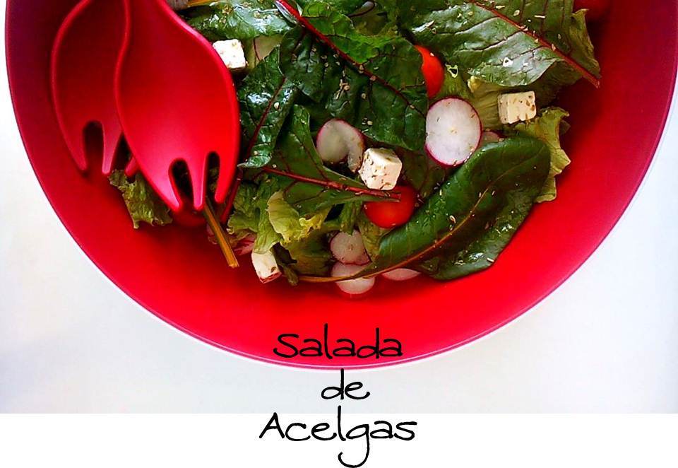As saladas fazem sempre parte das nossas refeições, tal como as sopas. Ter crianças em casa obriga-nos a ter mais cuidados com a alimentação. Por norma, utilizo a alface na base da maioria das saladas. Contudo, nesta salada, a rainha dos ingredientes foi mesmo a acelga, que riscou o verde da folha ora de vermelho ora de amarelo. Os rabanetes, os tomates-cereja, os cubinhos de queijo feta e os orégãos contibuíram também para esta paleta de cores e de sabores.