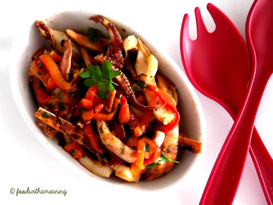 6. Disponha as tiras de lulas numa travessa. Decore com a salada de pimentos e verta por cima de tudo o molho preparado.
