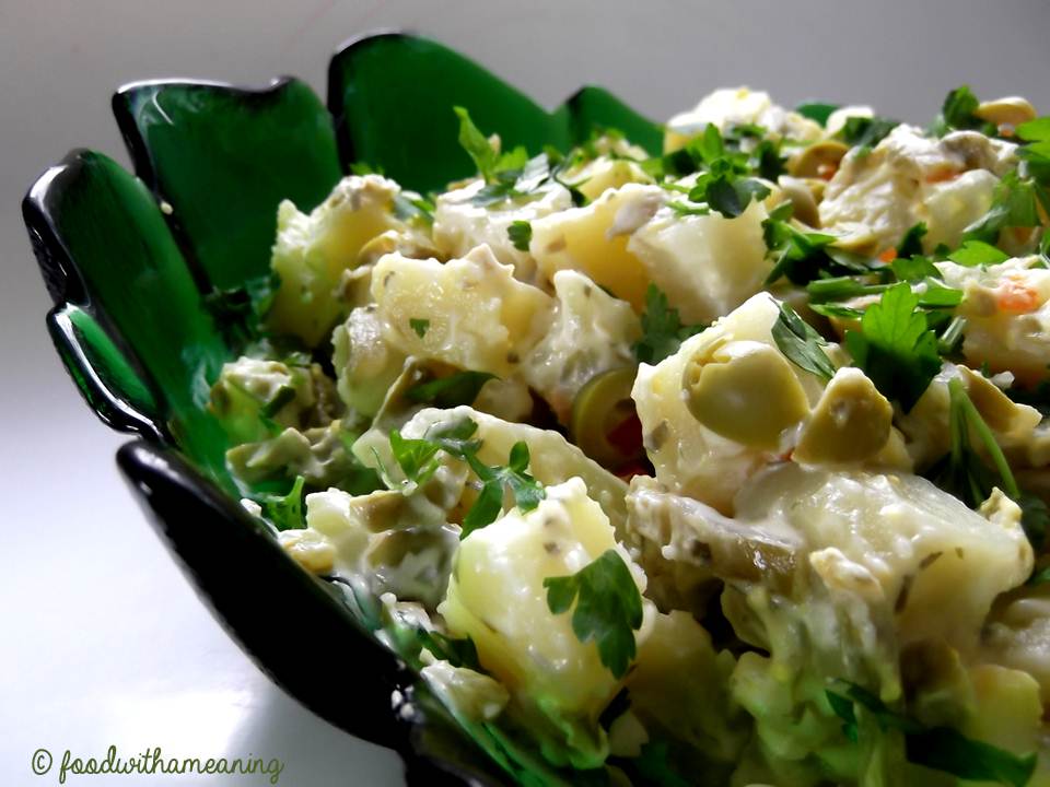 7. Coza as batatas aos pedaços em água temperada com sal e um pouco de noz moscada. Escorra-as e junte-lhes azeitonas recheadas picadas. Envolva a salada em maionese  e finalize com salsa picada.