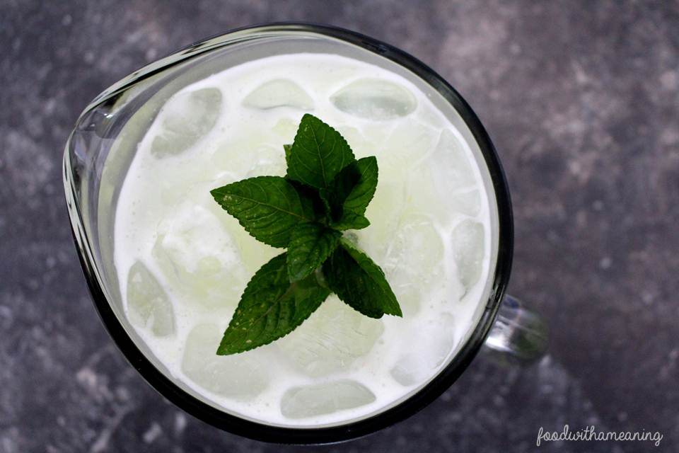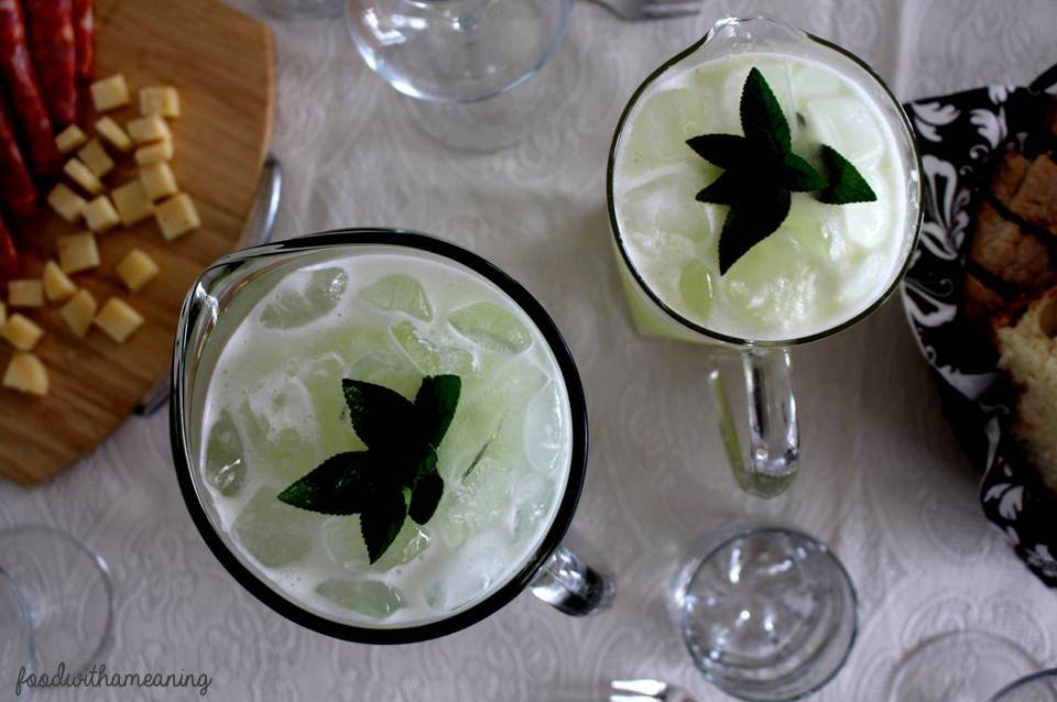 3. Colocar o cesto dentro do copo e coar para um jarro. Adoçar com o açúcar e mexer até dissolver. Juntar folhas de menta ou um único raminho, como desejar.