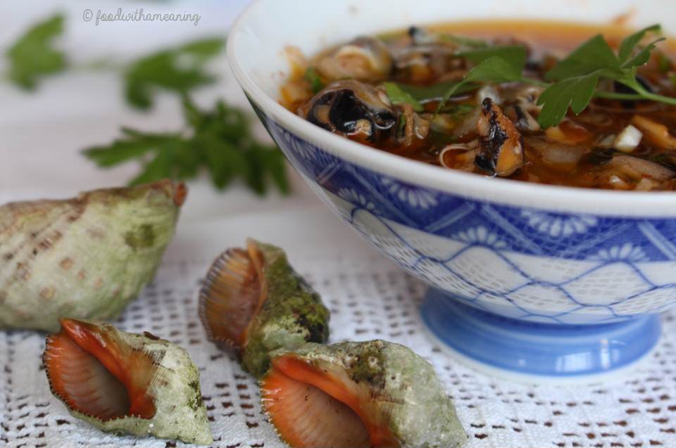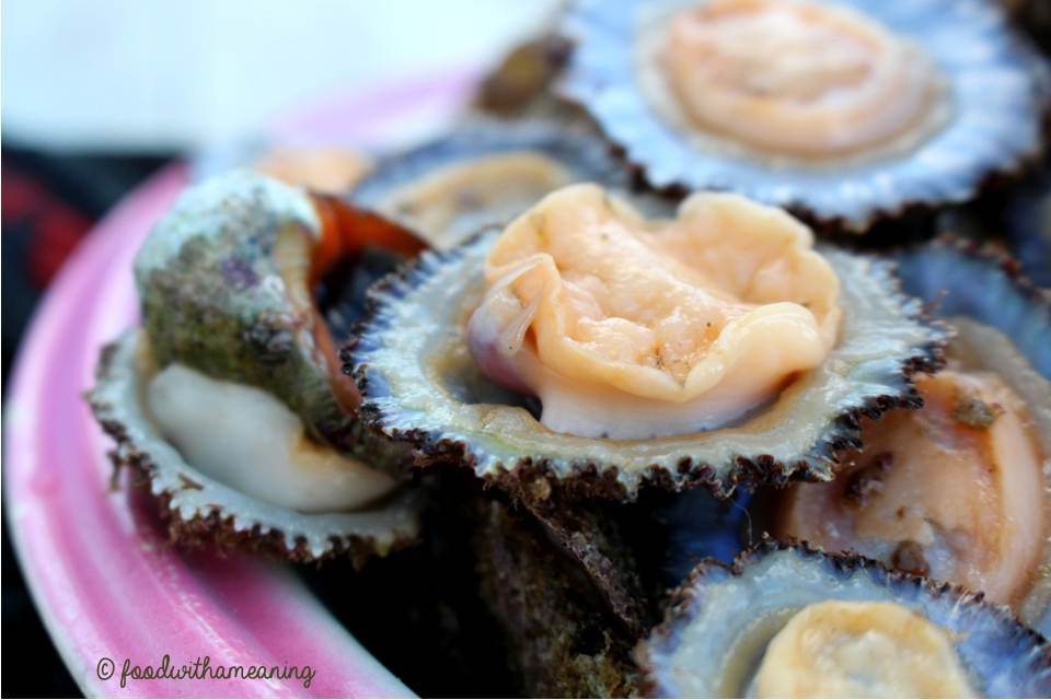 5. Colocam-se os búzios e as lapas num recipiente e prepara-se o molho em cima destes.