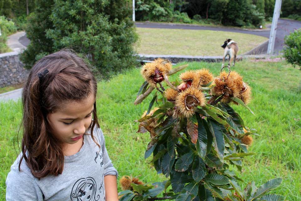 Diapositivo6Diapositivo4Diapositivo5 A Laica, a nossa pastor-alemão, o Stitch,um lindo e encorpado rafeirão que nos veio pedir acolhimento, e a Maxine, a nossa Labrador preta, que com a sua doçura e ainda meninice conquista qualquer coração, portaram-se à altura da situação, aproveitando para posar para as fotos. Eu e a minha filha de seis anos tivemos a nossa primeira apanha de castanhas a sério. Para o meu marido, transmontano de quase-gema (digo quase porque ele vive há mais tempo nos Açores do que os que viveu no nordeste português) a apanha da castanha é uma tradição com a qual cresceu. As castanhas da minha infância vinham do Pico, de barco, e dentro de uma saca de  serapilheira. Vinham de castanheiros que os meus avós tinham na zona das Tronqueiras, na ilha do Pico. Nunca assisti à apanha da castanha e só com esta idade é que tive a oportunidade de pisar os ouriços para libertarem as castanhas que se encontram no seu interior. A minha filha delirou com a experiência e divertiu-se a apanhá-las do chão para um saco. Que grandes eram elas. Tão bonitas! Tão robustas!