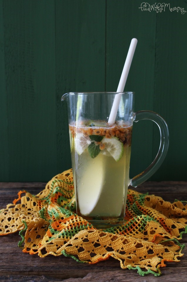 Esta limonada foi pensada como aproveitamento para três maracujás-banana que se encontravam na fruteira a aguardar utilização. Há dias que a pequenita cá de casa espreitava ansiosa os maracujás para os abrir ao meio e os comer de imediato com duas ou três colheradas. Desta vez troquei-lhe as voltas e ela mostrou-se de facto surpreendida quando viu os maracujás na limonada que acompanhou o jantar. Pensando bem, desta forma percebeu o conceito de partilha, tendo toda a família tido a oportunidade de os saborear.