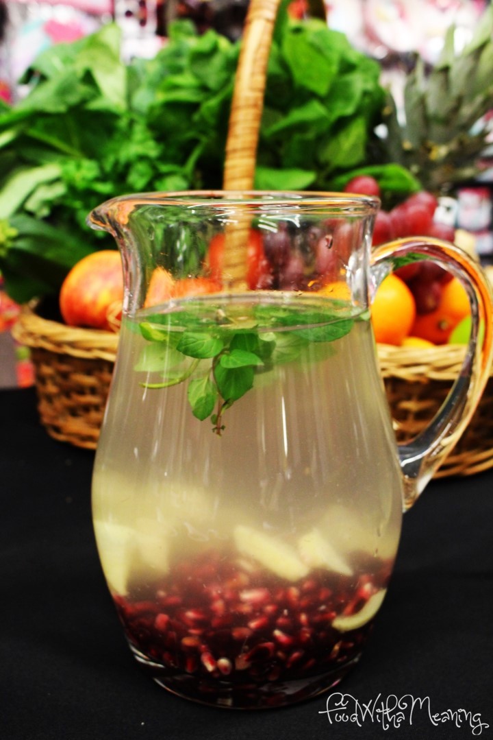 Juntar a água mineral, ou a água mineral gaseificada, bagos de romã e rodelas de gengibre descascado.