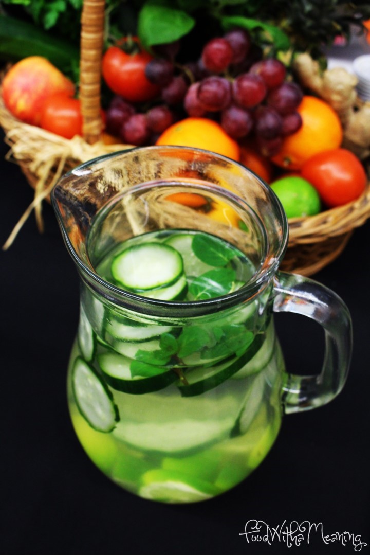 Juntar a água mineral, ou a água gaseificada naturalmente, rodelas finas de pepino com casca, raiz de gengibre descascada e rodelas de lima.