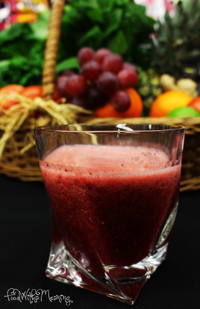 – 300 g de frutos silvestres congelados; sumo de 4 limões; sumo de 4 laranjas grandes; 15 g de sementes de chia; 2 colheres de sopa de mel; água até obter a consistência desejada. Cubos de gelo para servir. Pode substituir a água por chá de hibisco.