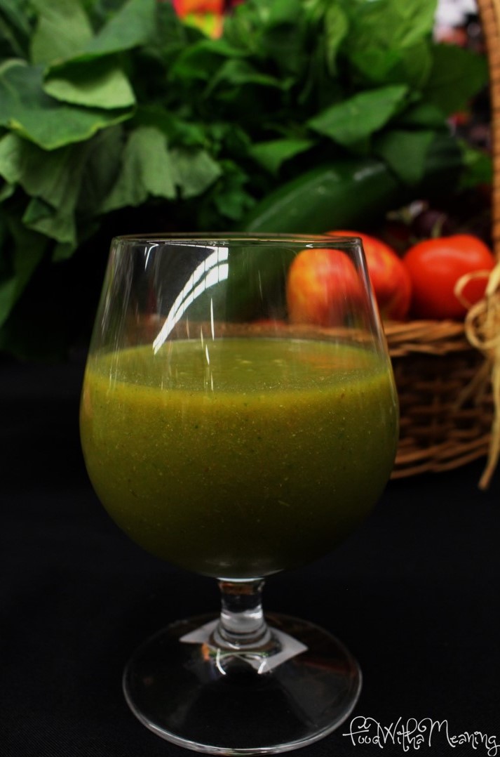 – 2 cenouras peladas ; 2 maçãs descascadas; 1 folha de couve; 1 pepino sem casca; sumo de 1/2 limão; 1 colher de sopa de sementes de linhaça triturada; 1 copo de água fresca; chá verde até obter a consistência desejada.