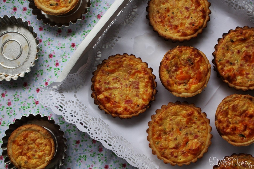 Retire a massa do frigorífico, forre uma superfície com película aderente e polvilhe ligeiramente com farinha. Estenda a massa nessa superfície e forre formas de tarteletes, previamente pinceladas com manteiga derretida. Pique o fundo de cada tartelete com um garfo. Encha cada forminha com o recheio. Leve a cozer a 200 ºC, em forno pré-aquecido, durante 30 minutos.