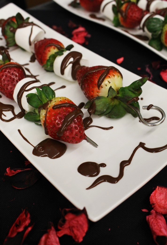 Lavam-se os morangos sem retirar o pé. Secam-se. Num pau de espetada, enfia-se primeiro um morango, depois um marshmallow, novamente um morango, um marshmallow e termina-se com um morango. Leva-se o chocolate a derreter (em banho-maria ou no micro-ondas desenham-se fios de chocolate por cima das espetadas.