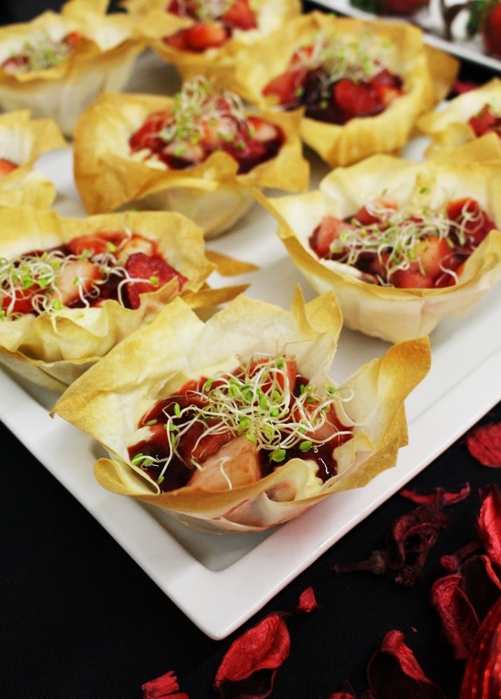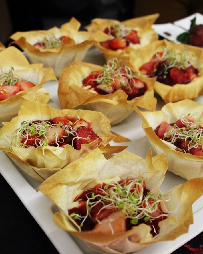 Flores de massa filo com morangos, creme inglês e topping de chocolate