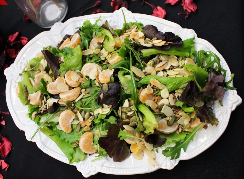 Salada Baby-Leaf com tangerina, sementes de girassol e de abóbora tostadas e amêndoa laminada