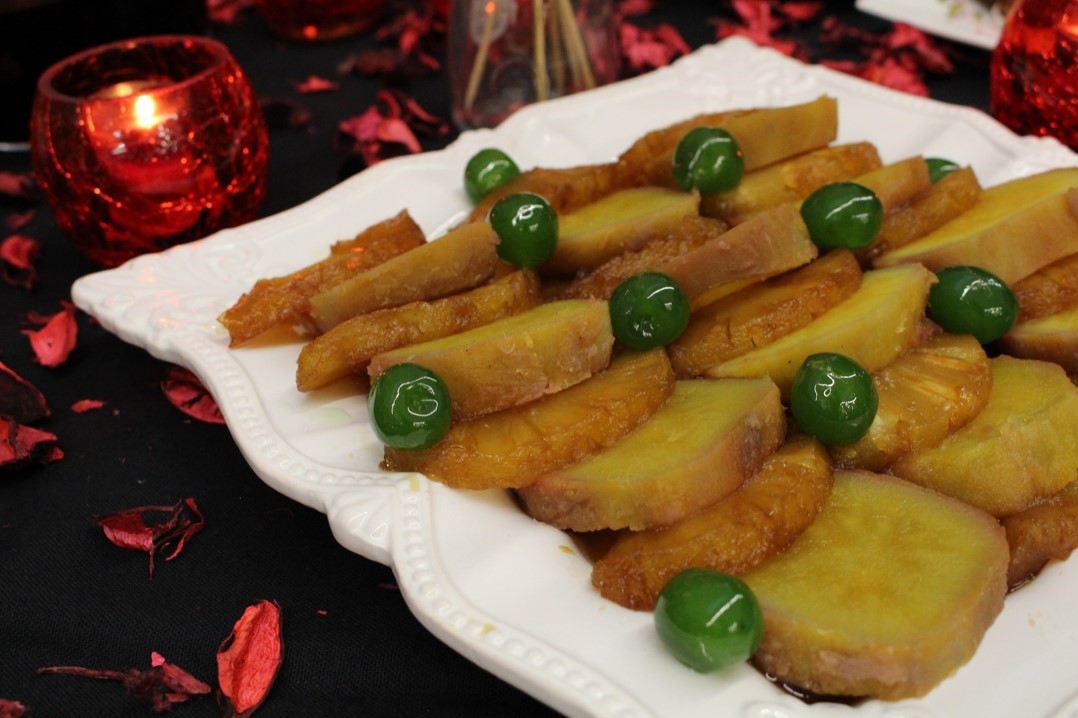 Coze-se a batata-doce com casca em água e sal. Retira-se a pele e corta-se às rodelas. Cortam-se em pedaços as rodelas de ananás. Numa assadeira, dispõem-se as rodelas de batata, intercaladas com pedaços de ananás. Verte-se a calda do ananás e polvilha-se com açúcar mascavado a gosto. Leva-se ao forno até que a batata absorva o molho.