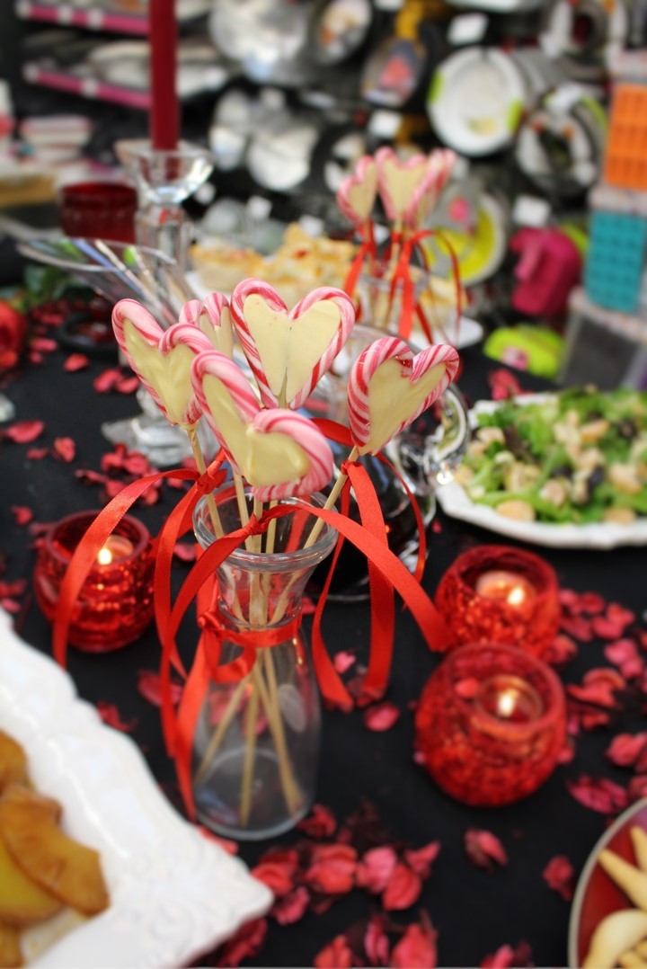 Dispor dois guarda-chuvas de rebuçado de menta em cima de uma folha de papel vegetal em formato de coração. Colocar no meio o pau de espetada e encher o centro com o chocolate derretido. Levar ao frigorífico até solidificar