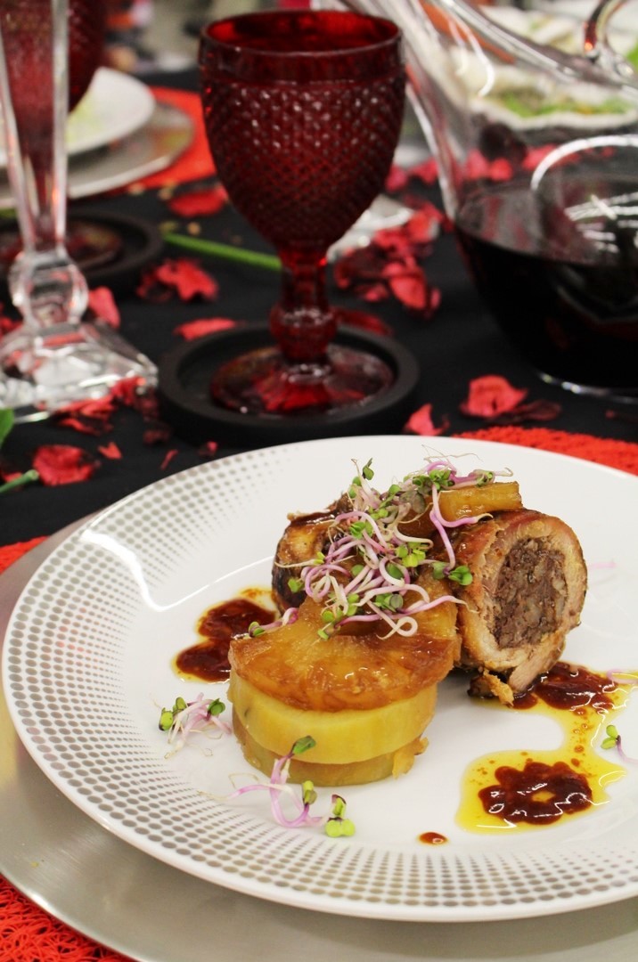 Rolinhos de Porco com Morcela com Torre de Batata-Doce e Ananás caramelizado