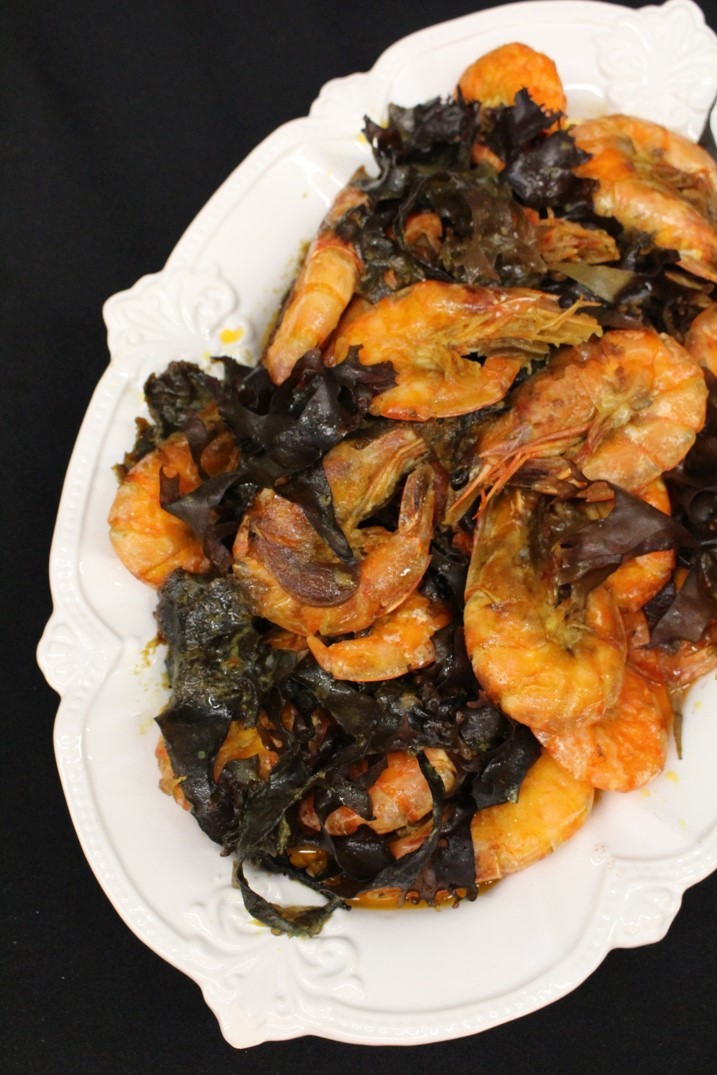 Retira-se o camarão do congelador e deixa-se descongelar num recipiente com água. Escorre-se muito bem. Numa tigela, colocam-se as algas, que se tapam com água para que hidratem. Numa frigideira grande, de paella, colocam-se dentes de alho esmagados, pedaços de manteiga, um pouco de azeite e piri-piri fresco. Quando a manteiga começar a derreter, vai-se adicionando o camarão até cobrir o fundo da frigideira. Deixa-se fritar de um lado e do outro. Reservam-se os camarões numa travessa. Verte-se por cima destes o sumo de meio limão. Na mesma frigideira, verte-se o leite de côco, tempera-se com sal e juntam-se as algas hidratadas e todos os camarões, envolvendo-os no molho. Deixa-se o molho apurar e serve-se de imediato com arroz branco ou marroquino (ver receita – acompanhamentos)