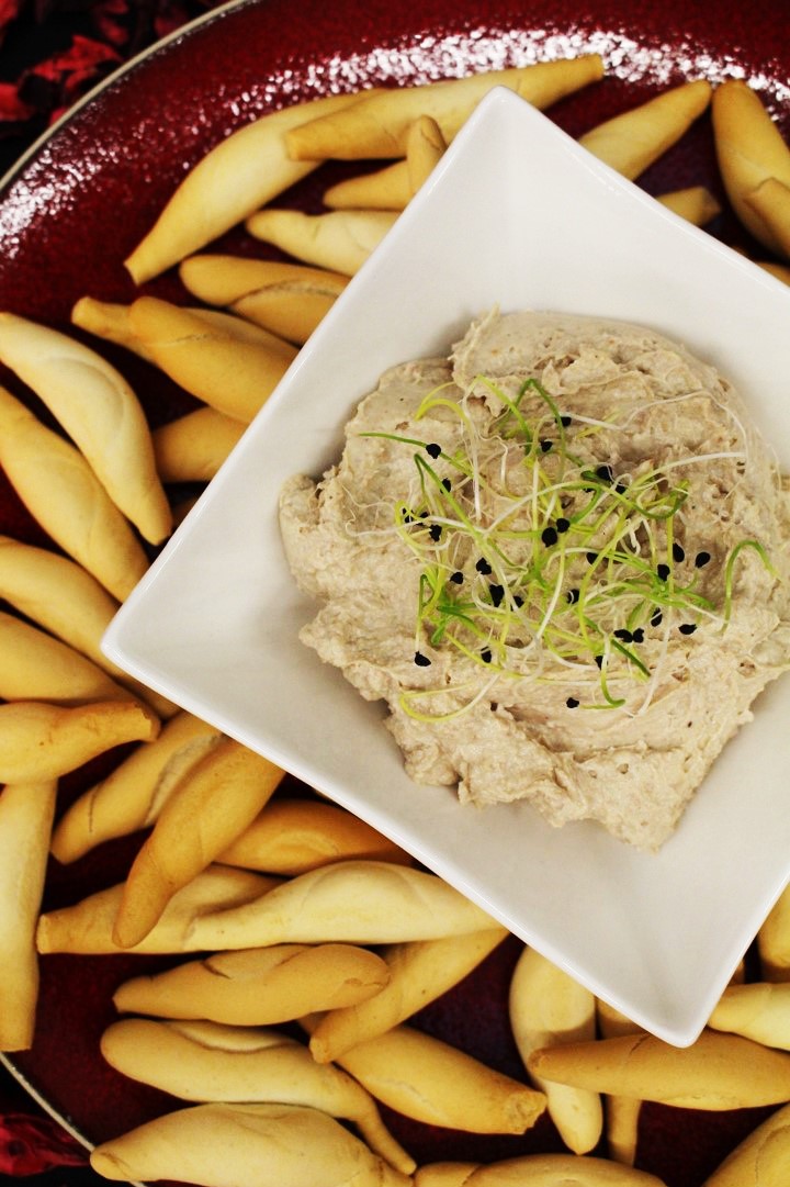 Inicialmente, iria servir o paté de veado como topping de crostini (fatias de baguete fininhas torradas no forno, pinceladas com azeite e salpicadas de pimenta). Resolvi simplificar a entrada e utilizei breadsticks (gressinos) de pão, de compra,  para acompanhar com o paté.