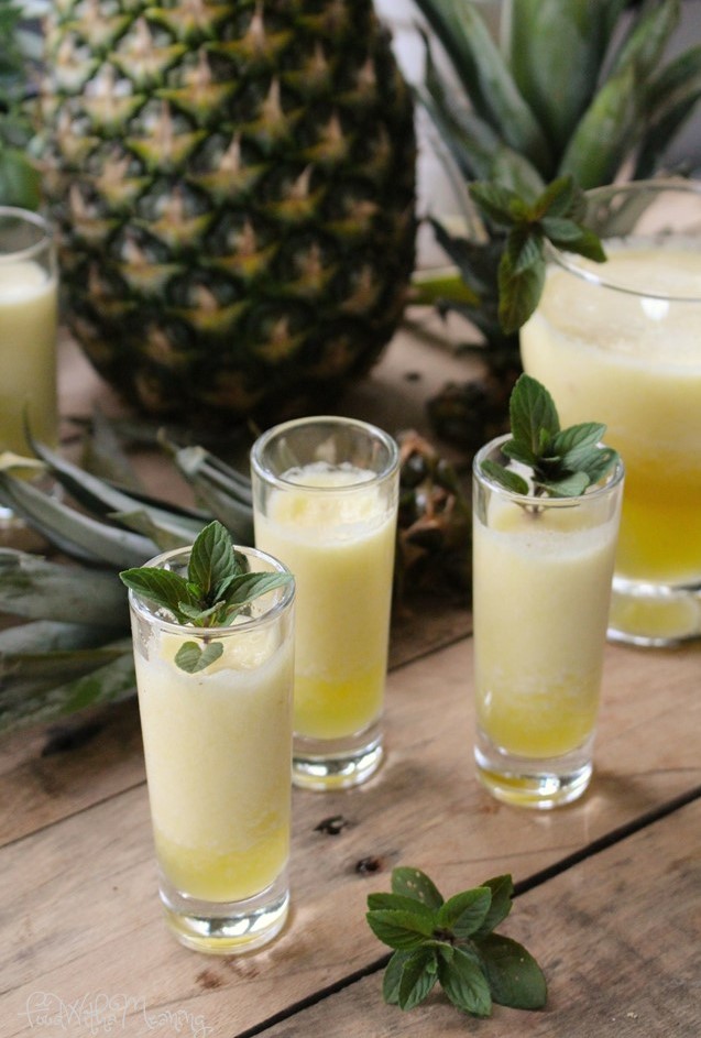 6. Sirva em copos de cocktail ou em copinhos de shot, guarnecidos com pedaços de abacaxi com casca ou raminhos de hortelã-pimenta.