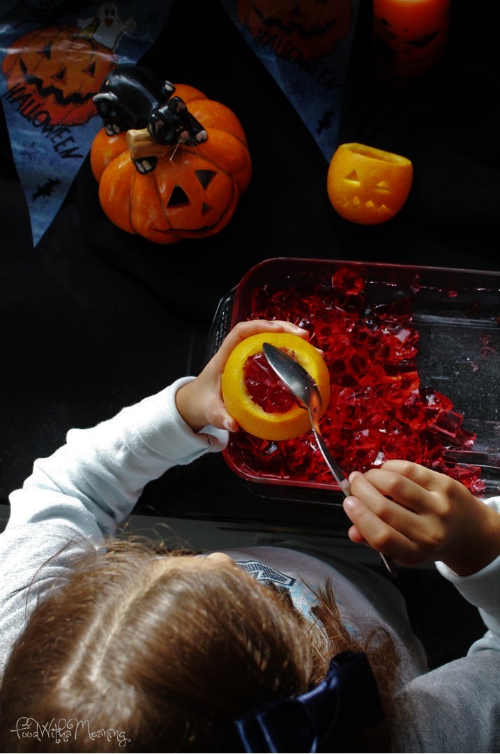 Como no armário despenseiro e na fruteira reuníamos todos os ingredientes, avançámos de imediato com a primeira fase da receita. Afinal era véspera de fim de semana e havia mais tempo para embarcarmos em art attacks! Lemos as duas, cuidadosamente, a receita, mas decidimos fazer algumas modificações. Optámos por utilizar gelatina sem adição de açúcar, muito mais saudável. Tratámos, de seguida, de fazer a gelatina de framboesa, uma embalagem com duas saquetas, de acordo com as instruções do pacote, mas substituindo também a adição de água fria por sumo de frutos vermelhos. Colocámos a gelatina num pyrex e levámo-la a pernoitar no frigorífico. Hoje, de manhã, e com uma faca, transformámos o lençol de gelatina em mil cubinhos, com cortes horizontais e verticais. Abrimos uma tampa no cimo de duas laranjas e, com cuidado, retirámos a polpa e o sumo de duas laranjas. Depois, veio a fase mais divertida quando começámos a esculpir os olhos e a boca da nossa cabeça gelatinosa. Por fim, enchemos as cabeças com a gelatina de framboesa e começámos a montar o cenário para as nossas fotos com lanternas em forma de abóboras, velas e aranhas ao jeito halloweenesco!