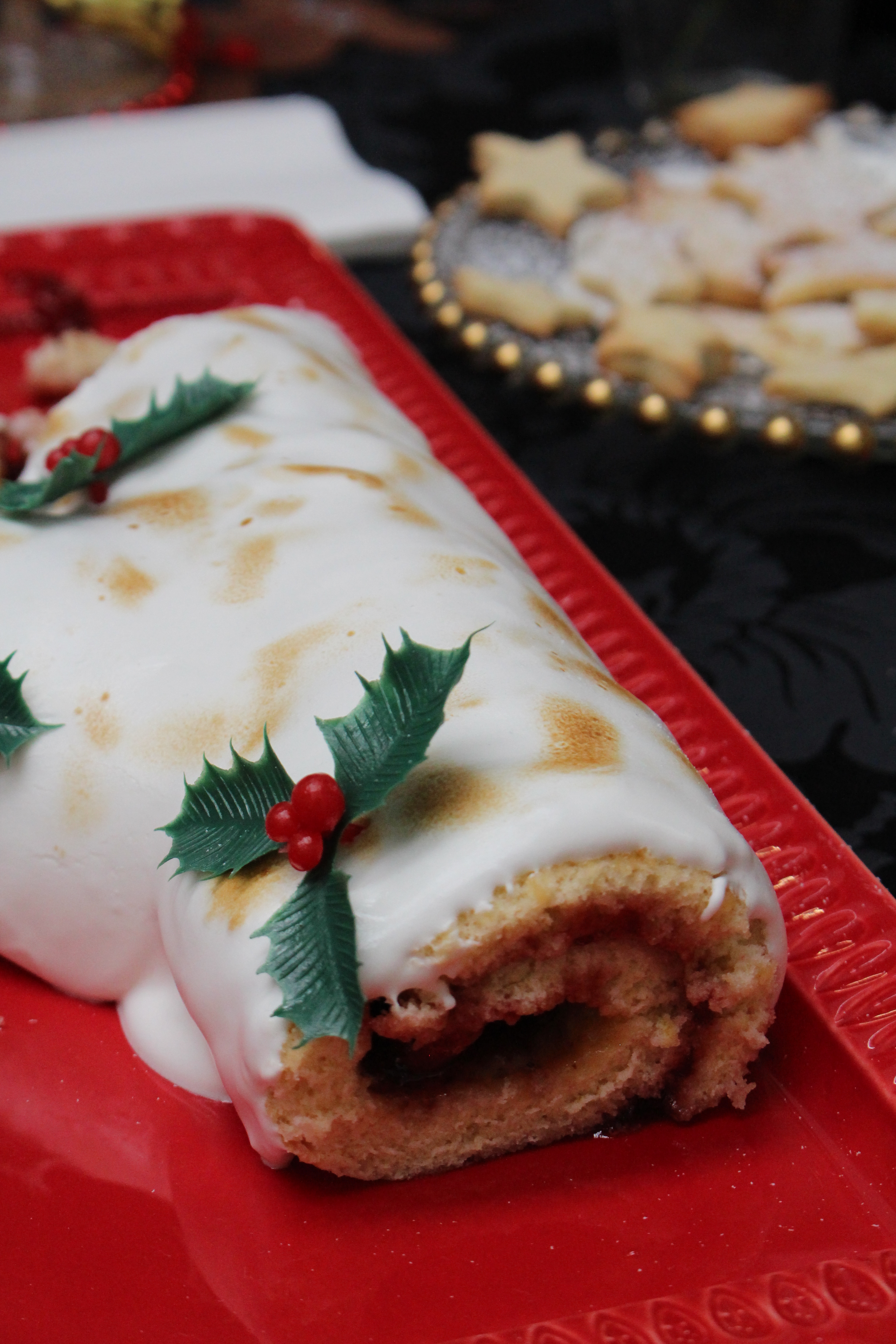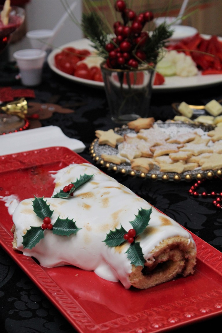 Os troncos de natal são quase sempre apresentados com cobertura de chocolate negro, mais especificamente com ganache. Desta vez, resolvi fazer uma cobertura branca, a fazer lembrar a neve, tão característica desta época nos países frios. A massa foi aromatizada com raspa de limão e para o recheio utilizei compota de frutos vermelhos, com redução de 30% de açúcar.