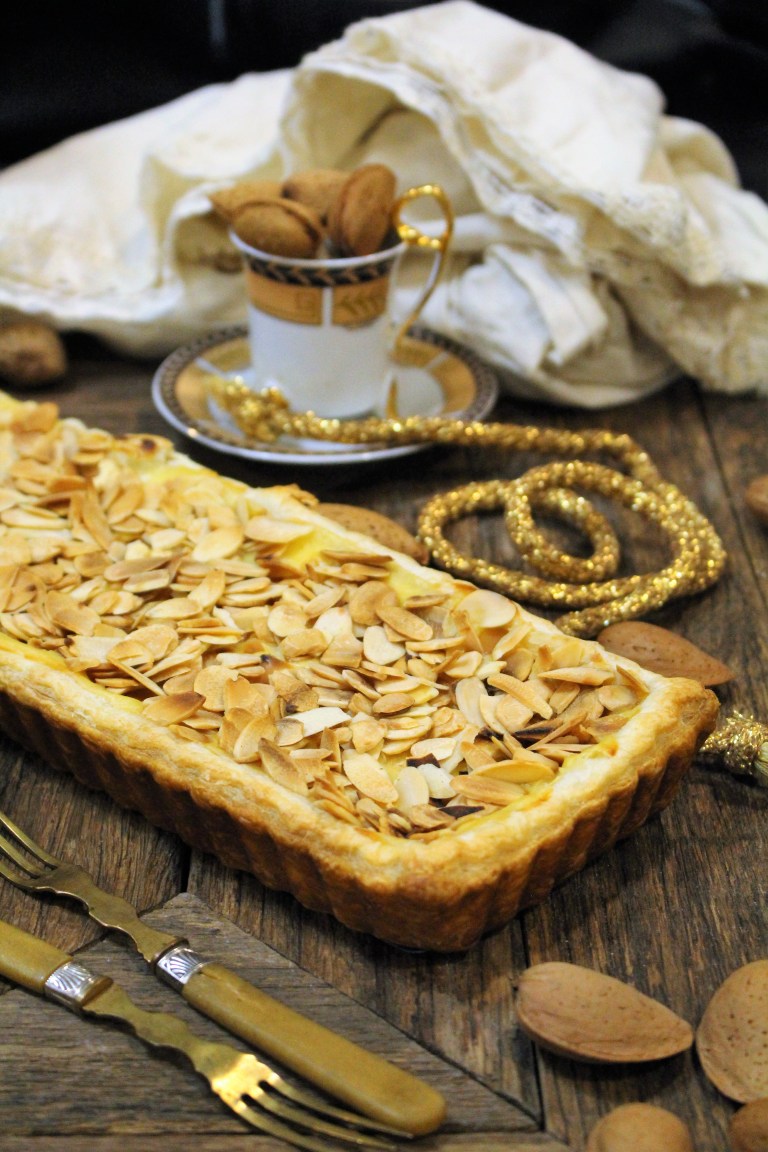 Depois de uma série de cinco workshops que dinamizei no mês de dezembro e de dez dias de férias longe de casa, de tachos e panelas, sabe bem, no regresso, arranjar novos argumentos para estar na cozinha. Neste caso, tratou-se de aproveitar uma base de massa folhada em aproximação do fim do prazo de validade. Tendo em conta que o Natal é sempre uma época de de algum exagero alimentar, queria que o recheio da tarte fosse saboroso, mas pouco calórico. Optei pelo leite creme, que fiz no robô de cozinha. Finalizei com amêndoa laminada torrada. Esta é mesmo uma sobremesa muito fácil e deliciosa para comemorar o Dia de Reis.