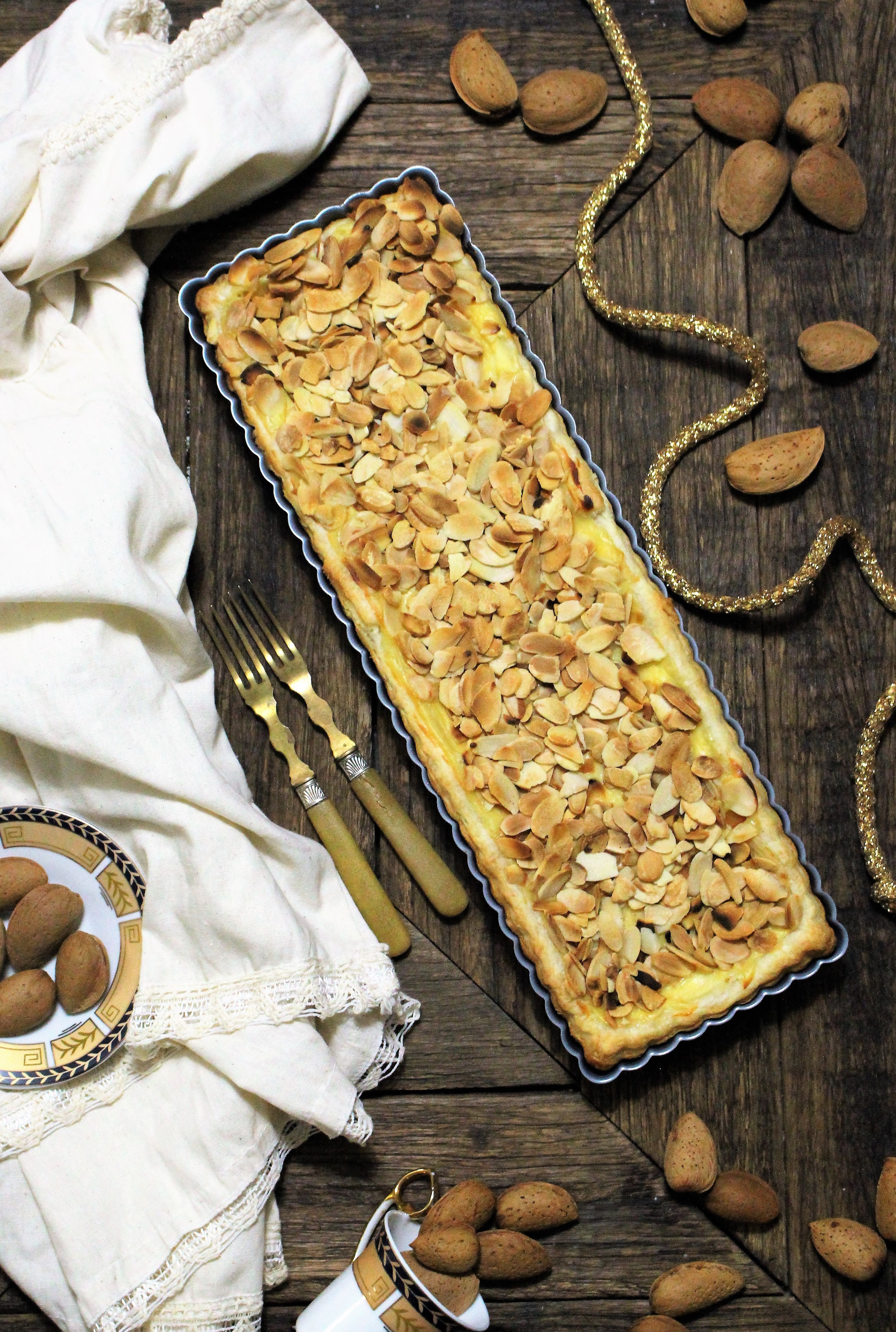 Depois de uma série de cinco workshops que dinamizei no mês de dezembro e de dez dias de férias longe de casa, de tachos e panelas, sabe bem, no regresso, arranjar novos argumentos para estar na cozinha. Neste caso, tratou-se de aproveitar uma base de massa folhada em aproximação do fim do prazo de validade. Tendo em conta que o Natal é sempre uma época de de algum exagero alimentar, queria que o recheio da tarte fosse saboroso, mas pouco calórico. Optei pelo leite creme, que fiz no robô de cozinha. Finalizei com amêndoa laminada torrada. Esta é mesmo uma sobremesa muito fácil e deliciosa para comemorar o Dia de Reis.