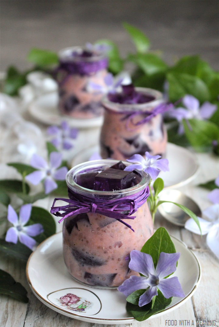 |Se preferir seguir a sugestão das fotos, faça gelatina de mirtilo (ver abaixo), deixe que solidifique num pirex retangular e corte-a em cubos, misturando, posteriormente os cubos de gelatina com o iogurte de araçá. Terá assim uma sobremesa saudável e deliciosa.
