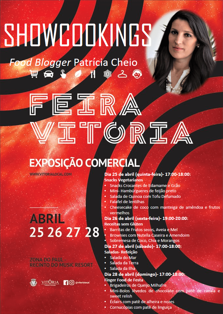 A convite da Praia Cultural, e no âmbito da IV edição da Feira Vitória, irei desenvolver uma série de showcookings dedicados a quatro temas muito atuais. O primeiro tem já início na próxima quinta-feira, 25 de abril, às 17:00. Todos têm a duração de uma hora, à qual se segue uma prova pública de degustação dos pratos confecionados. A ementa encontra-se no cartaz e abaixo na publicação. Prometo-vos quatro sequências deliciosas!