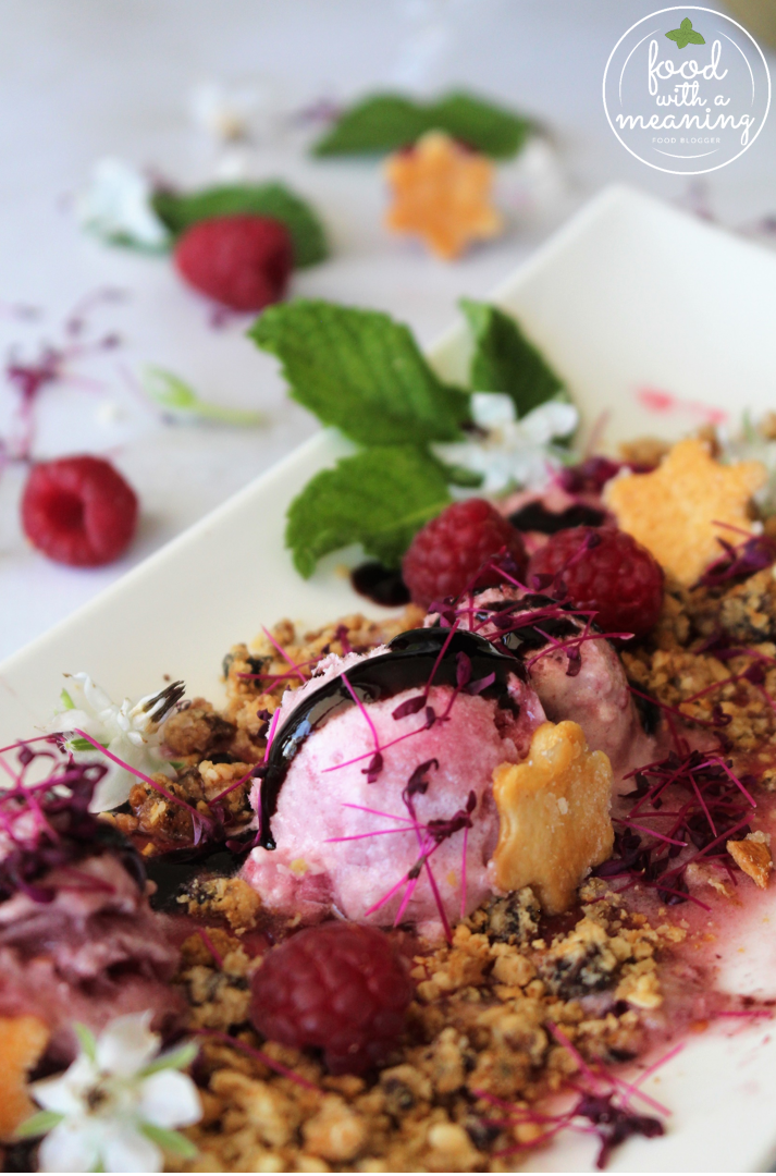 Gelado de framboesa com crumble de uva-passa, bolacha folhada e coulis de uva
