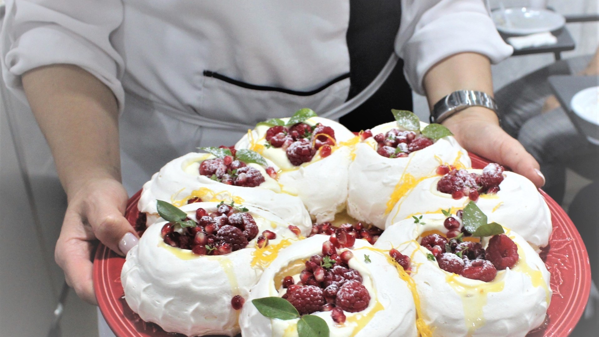 A receita que vos trago hoje foi confecionada no showcooking que desenvolvi no fim de semana passado para os Supermercados Guarita, totalmente dedicado a receitas de Natal. Assim sendo, e para se enquadrar na quadra, alterei a convencional apresentação da pavlova, criando um formato de coroa natalícia, formada por mini-pavlovas.