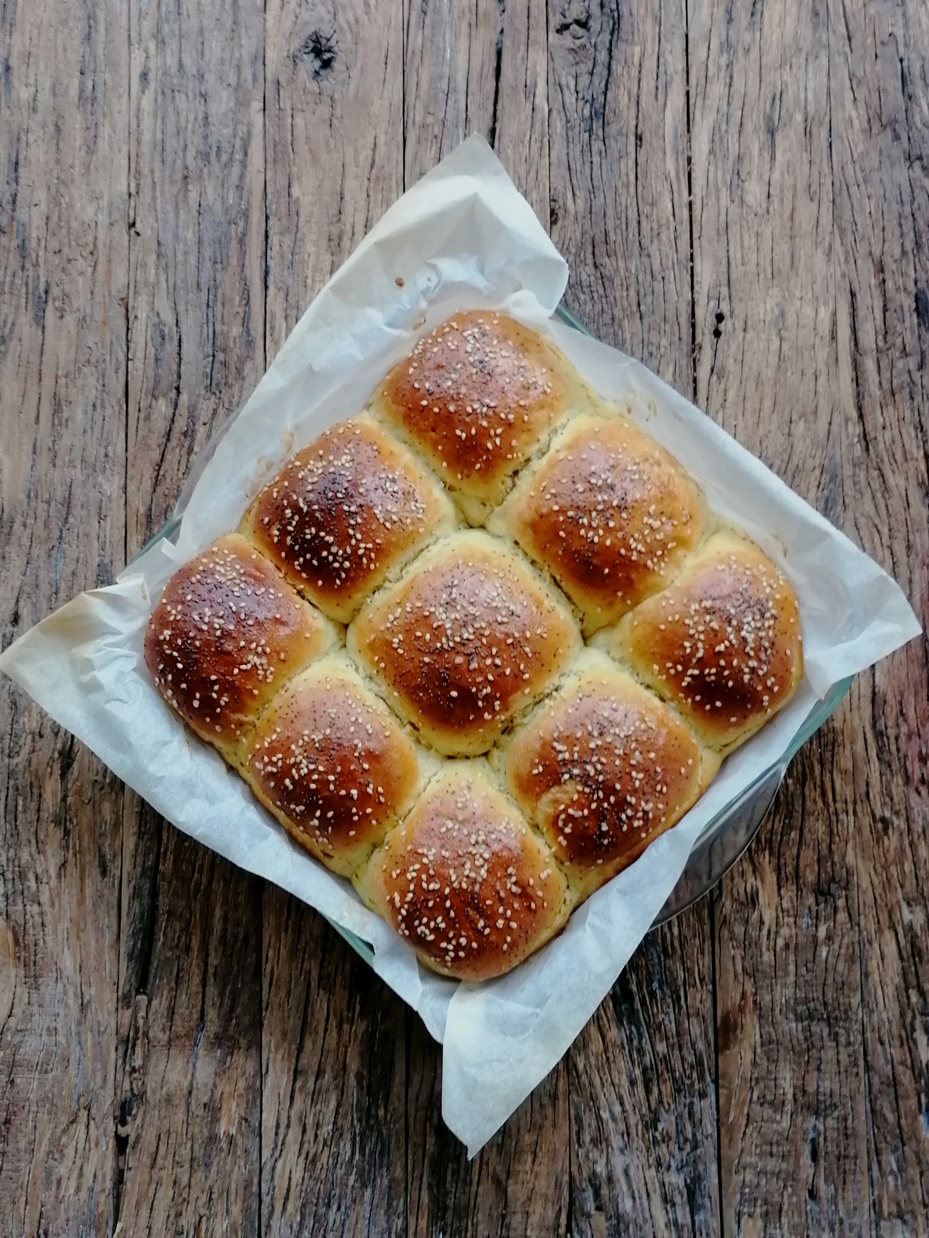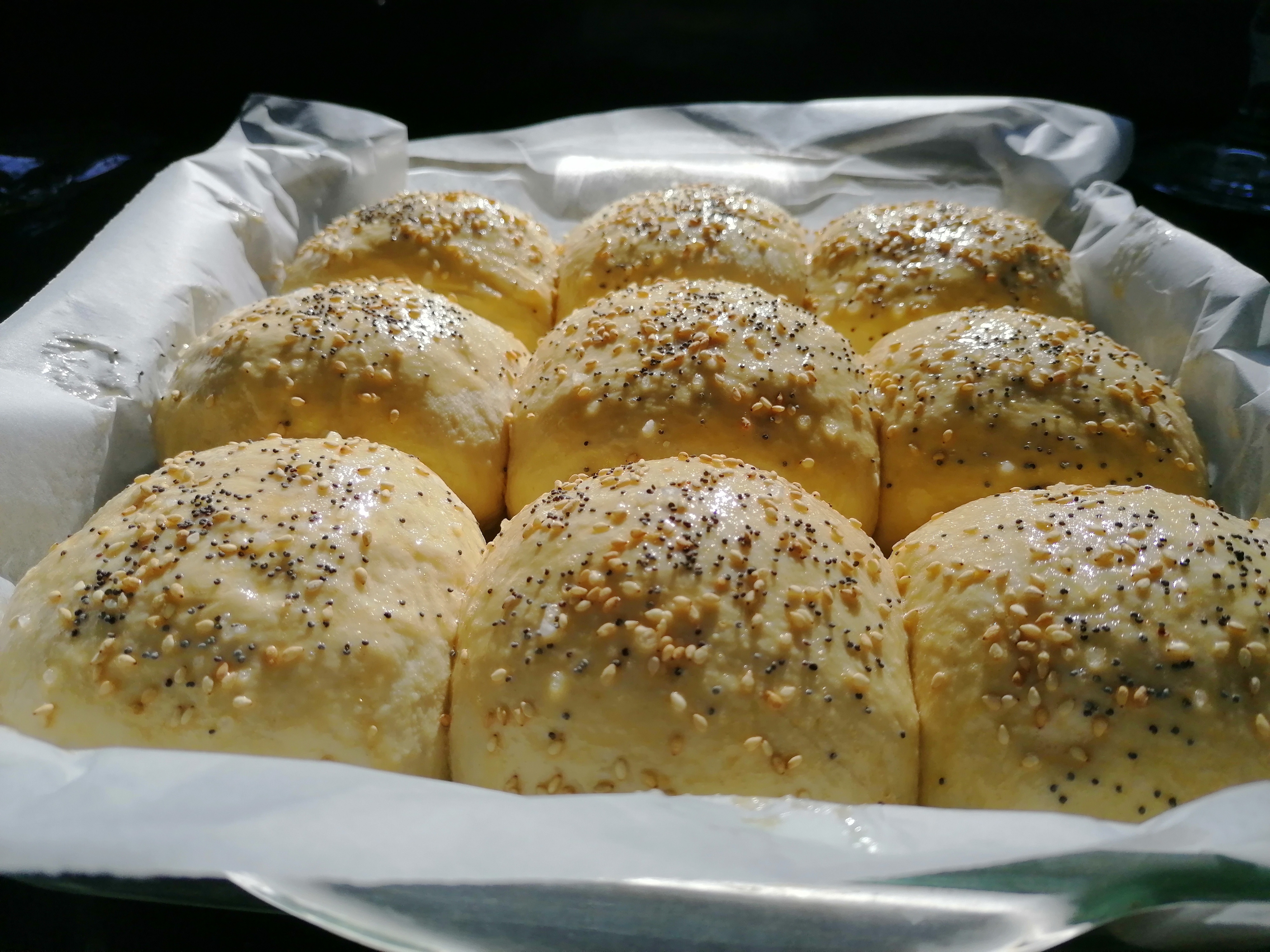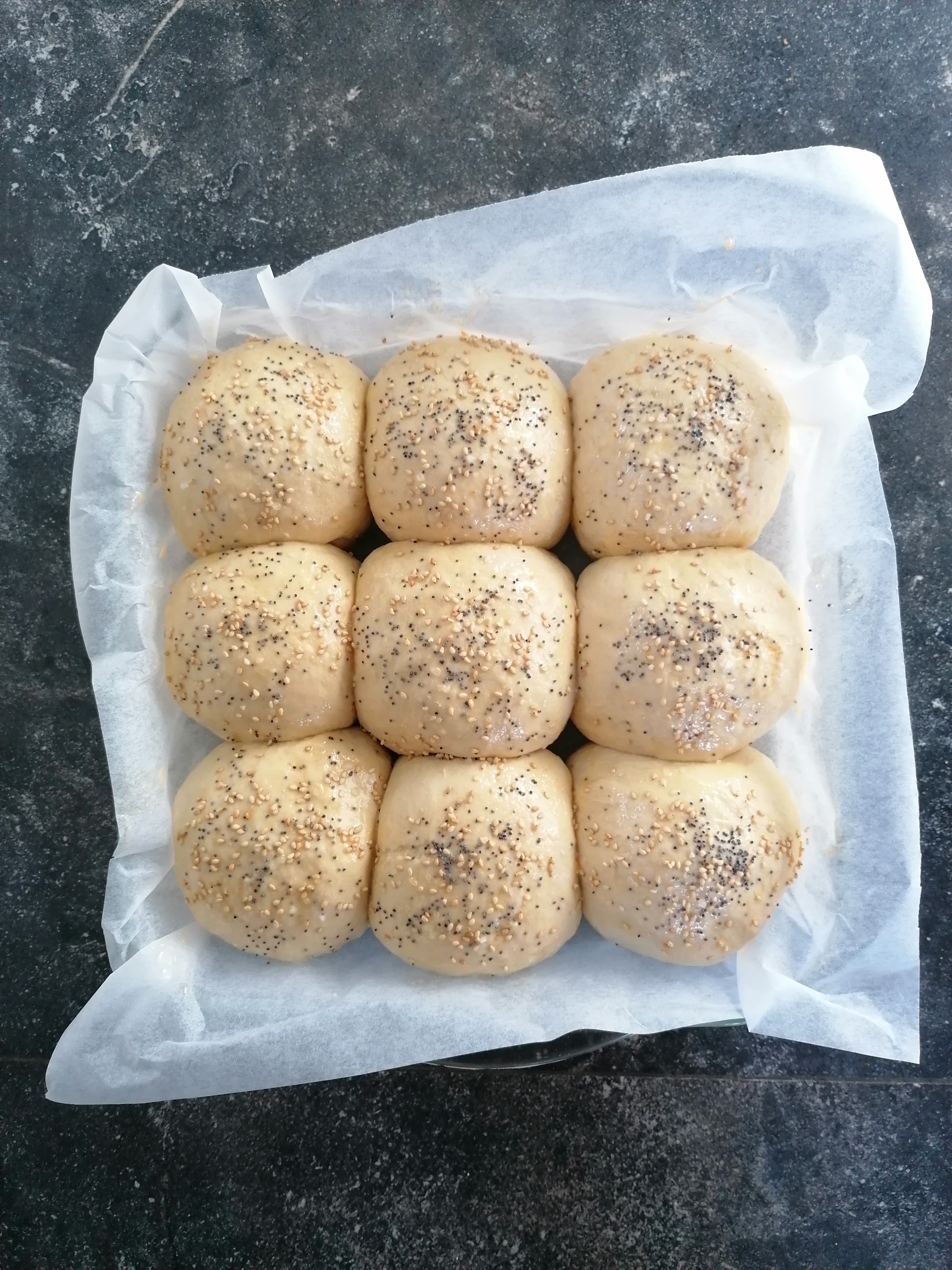 Antes de colocar no forno, pincele os pãezinhos com gema de ovo e finalize com sementes de sésamo e de papoila.