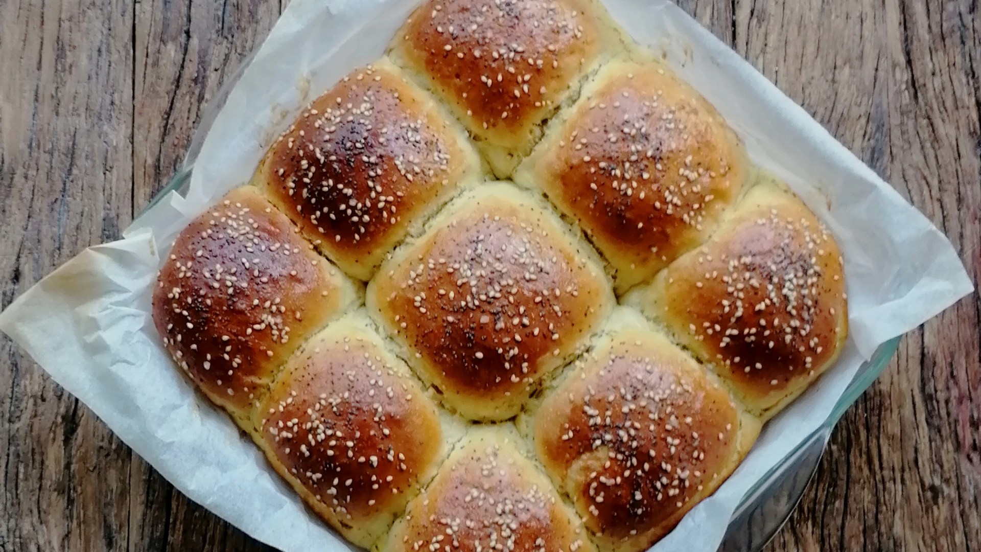 Antes de colocar no forno, pincele os pãezinhos com gema de ovo e finalize com sementes de sésamo e de papoila.