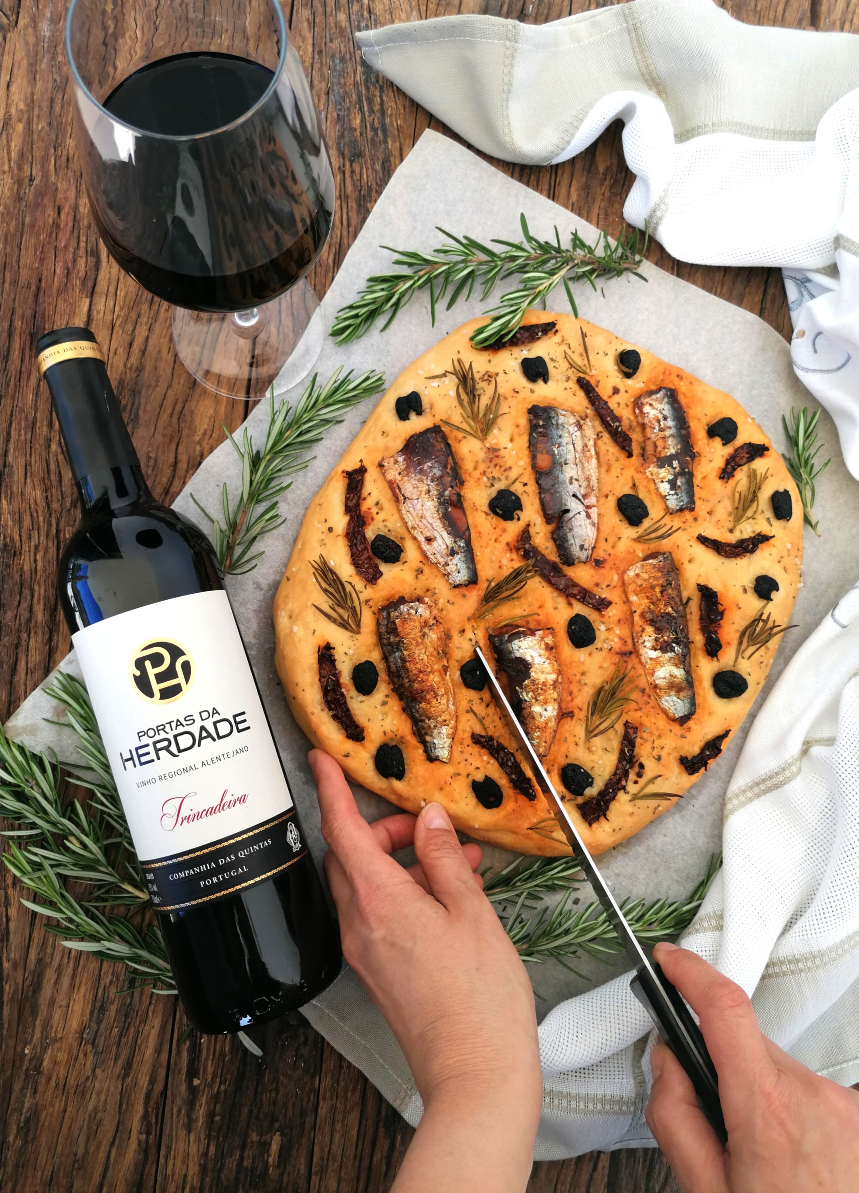 Sirva a focaccia de Sardinhas com um copo de vinho da sua eleição.