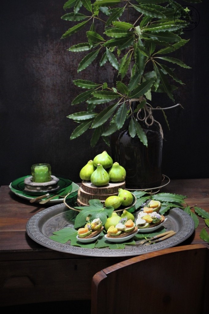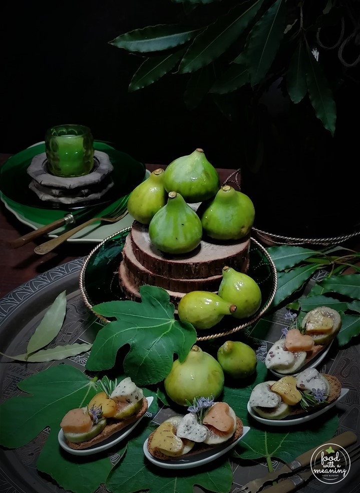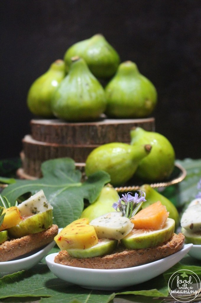 A combinação de ambos resultou numa bruschetta de figos com corações de quatro queijos Quinta dos Açores: alho e açaflor; pimenta da terra; sementes; alho e salsa.