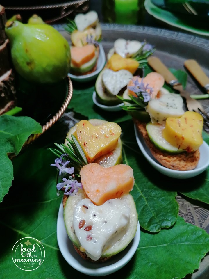 3. Disponha as rodelas de figos em cima das tostas ou as torradas e finalize com os corações de queijo.