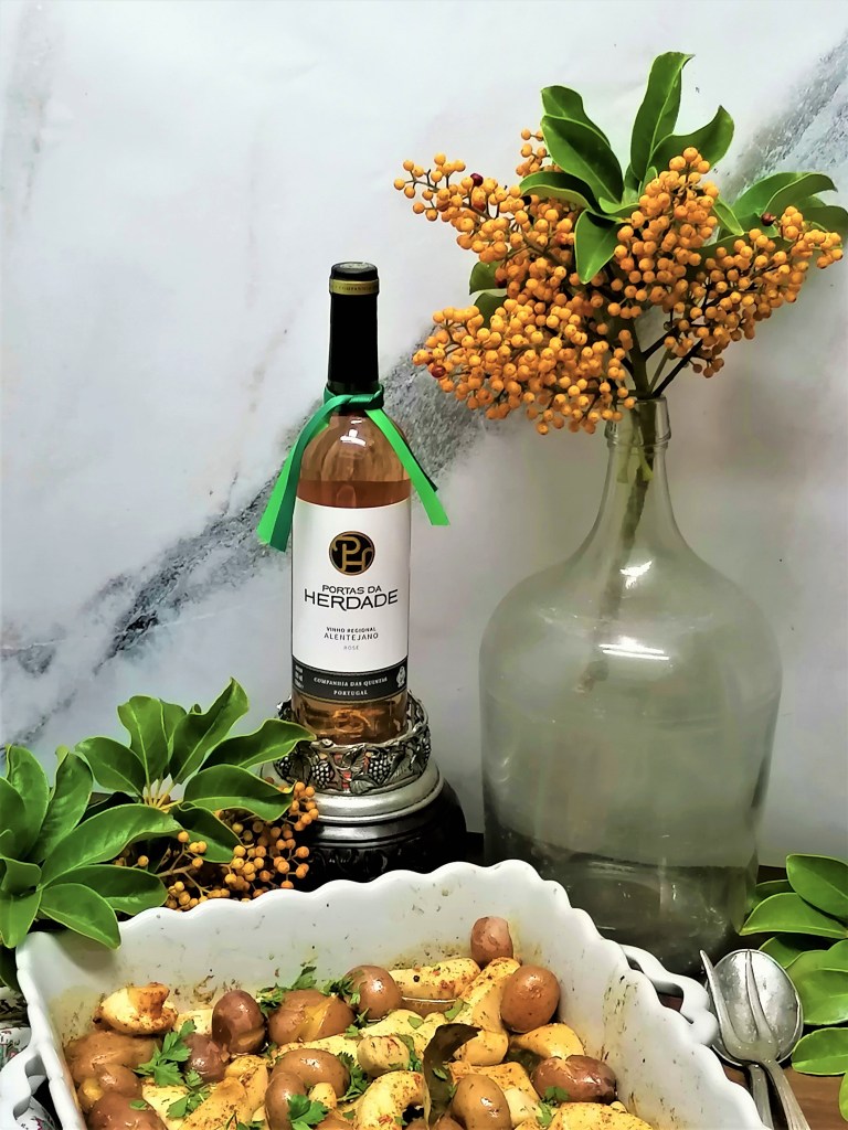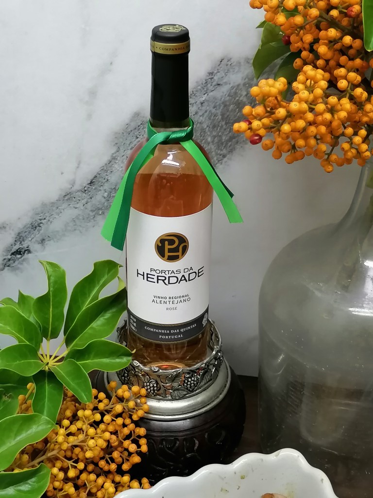 Acompanhámos com Portas da Herdade rosé, um vinho alentejano, produzido pela Companhia das Quintas, com uma cor rosa pálida muito atraente, com aroma intenso a cerejas e frutos vermelhos. Na boca é fresco, equilibrado com um final longo e agradável.